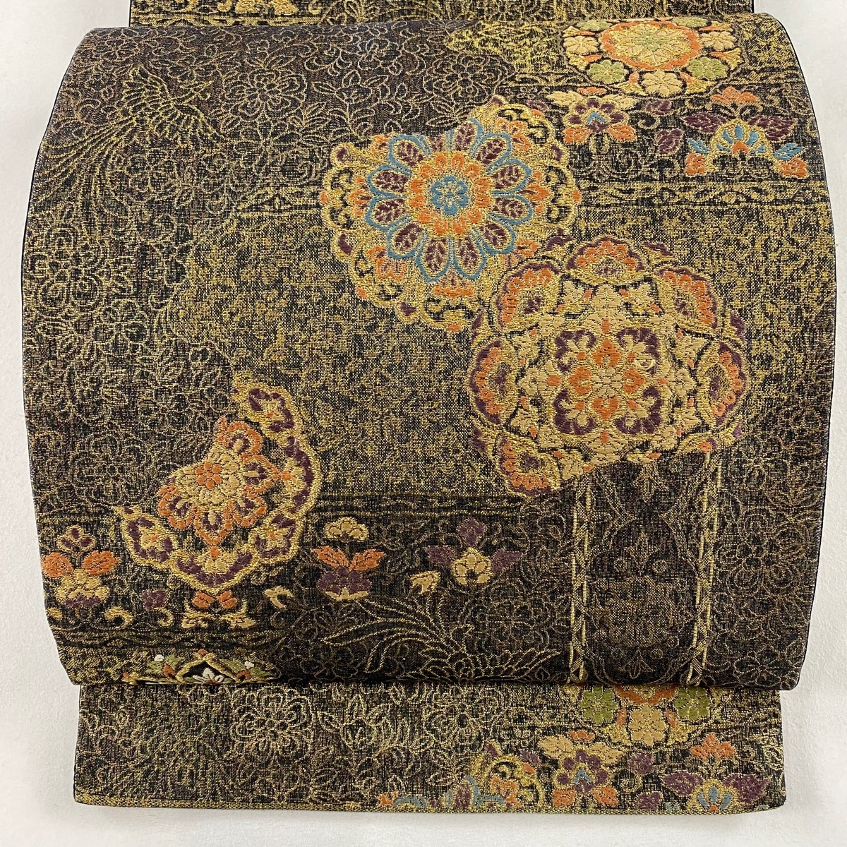 - 袋帯 秀品 華文 花鳥 唐織 箔 茶緑色 六通 正絹 【中古】