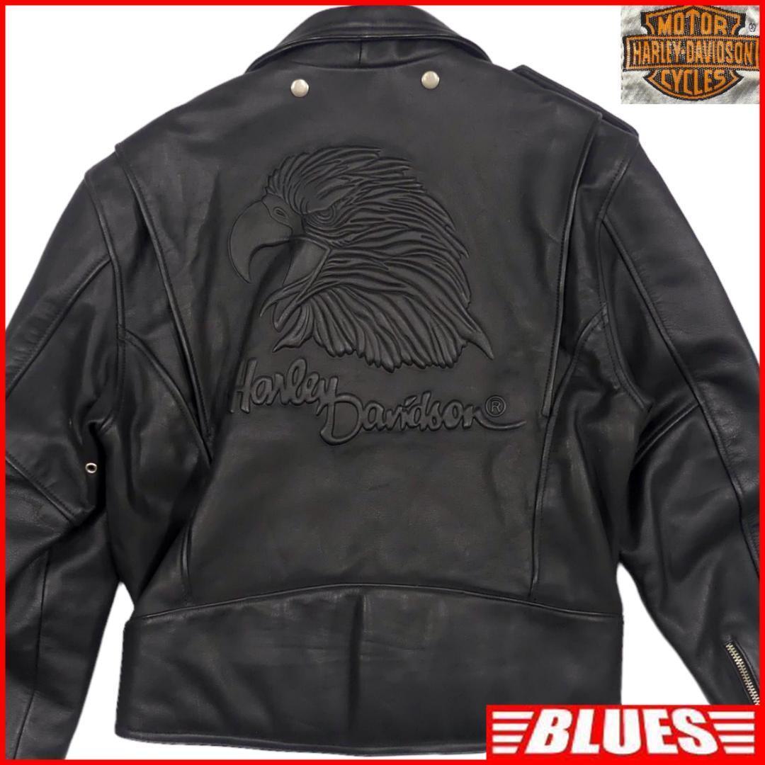 - 即決★HARLEY DAVIDSON★メンズM レザーライダースジャケット ハーレーダビッドソン M 黒 エンボス 80s ヴィンテージ 本革 ダブル