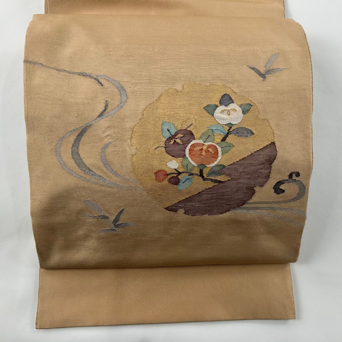 - 袋帯 美品 秀品 鈴乃屋 雪輪 流水 薄オレンジ お太鼓柄 正絹 【中古】