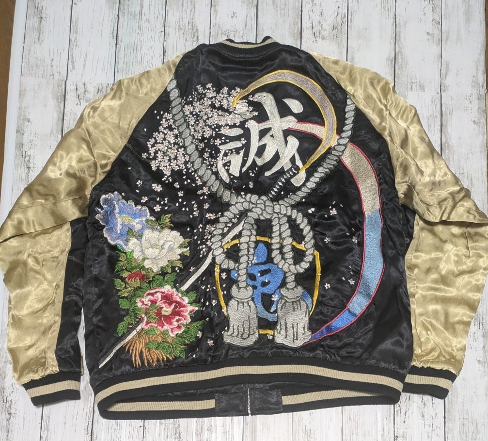 - 百花繚乱 スカジャン 新撰組 和柄 刺繍 リバーシブル スーベニアジャケット XL ブラック×ゴールド サイカイ 新選組