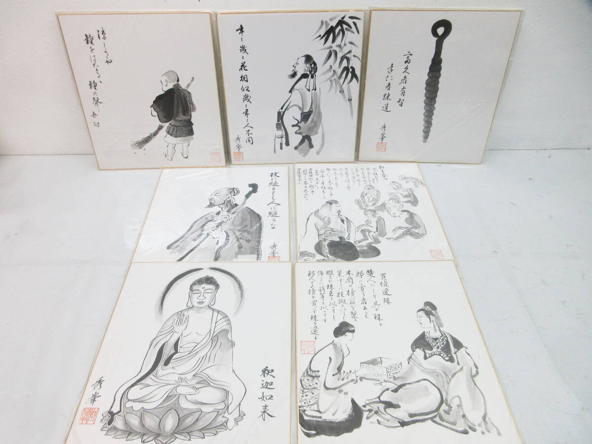 FF342【色紙画】銘あり 7枚★秀峯 作 真作 直筆★買還珠 朝三暮四 釈迦如来 与謝蕪村 etc★厚手 色紙絵★希少品 ?★保管品★