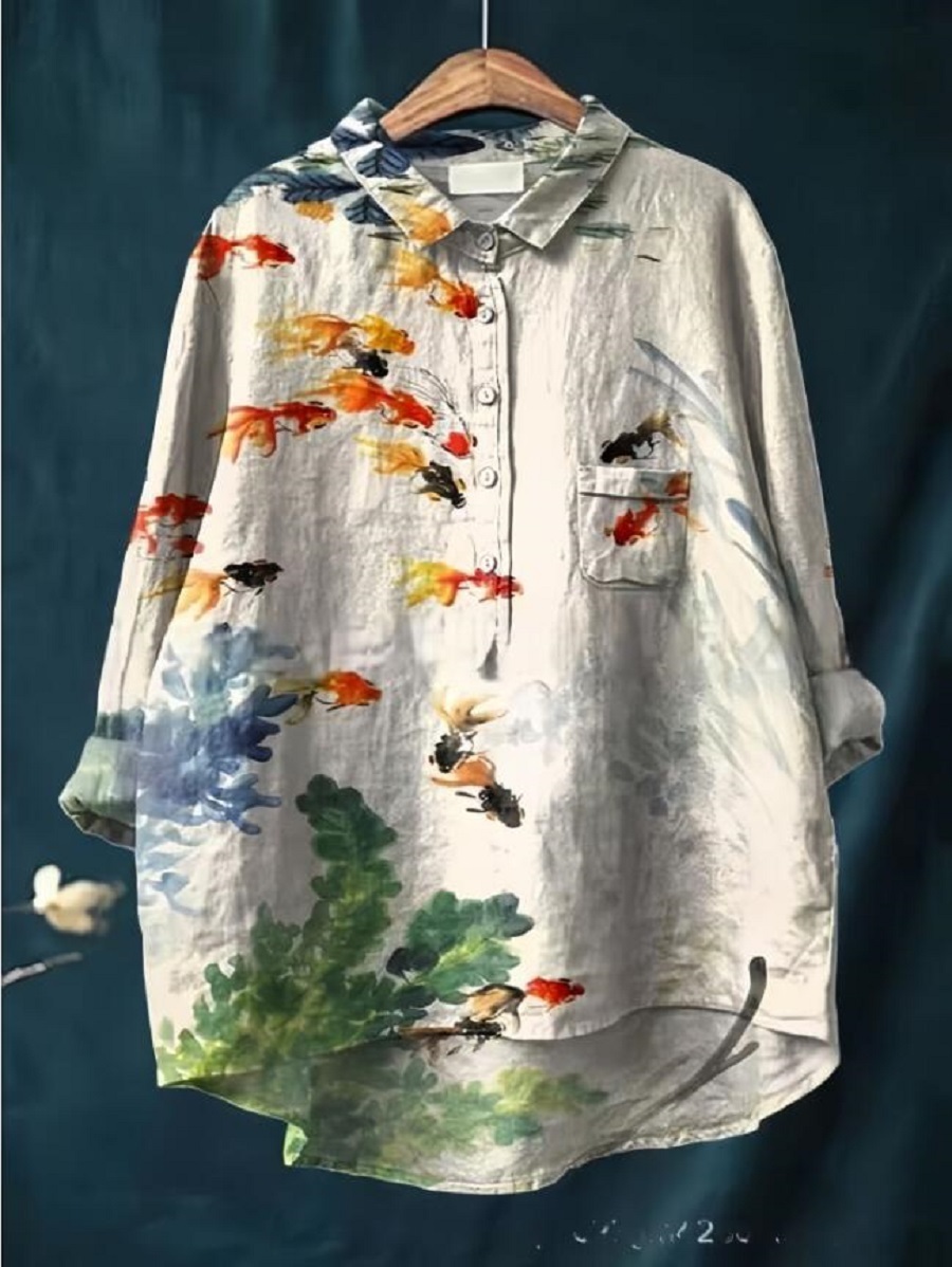 - 同梱1万円送料無料■オシャレ シャツ ブラウス 着痩せ チュニックシャツ 綿麻 プリント柄 トップス レ ディース 長袖 体型カバー 白