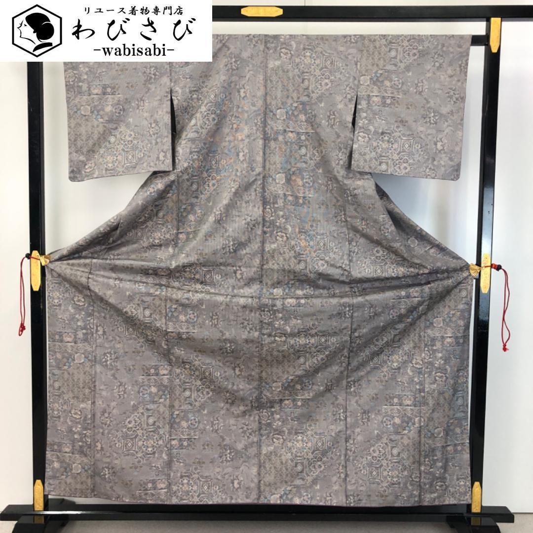 - 本場大島紬 白大島 一元7マルキ 蜀江紋様 花模様 燻銀色 K-5113 着物 きもの kimono 和服 和装 中古 リサイクル着物 【送料無料】
