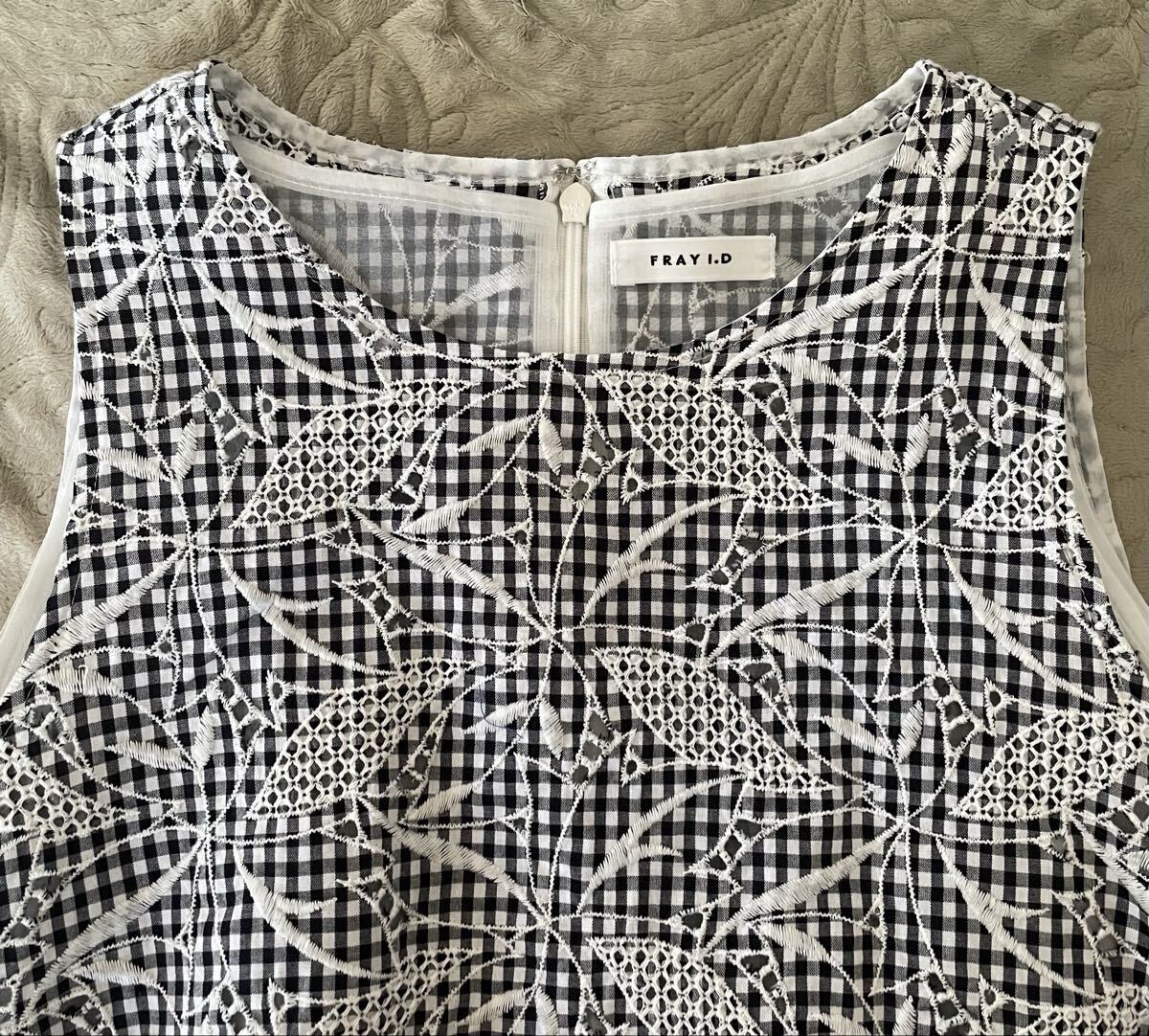 - FRAY I.D 刺繍 ブラウス ノースリーブ ギンガムチェック ボタニカル 黒白 綿100% コットン ファスナー フレイアイディー 0 日本製
