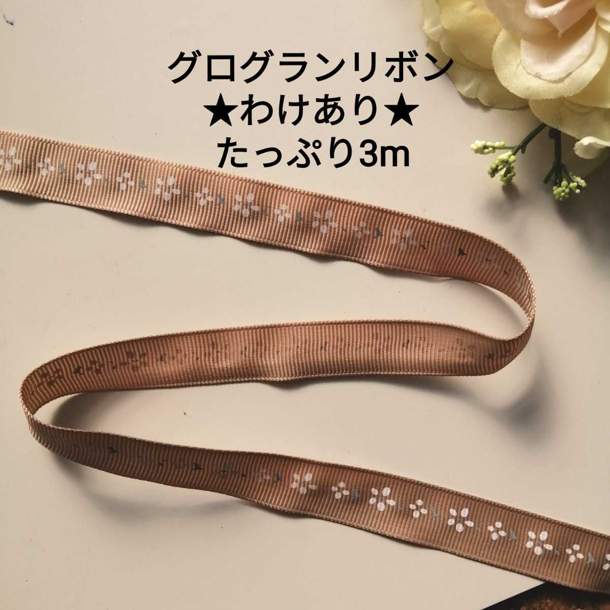 > 薄茶★グログランリボン★たっぷり3m★切り売り★幅約1.6cm★片面★花柄★難あり品★わけあり ヘアゴム 手芸用品 ハンドメイド ラッピング