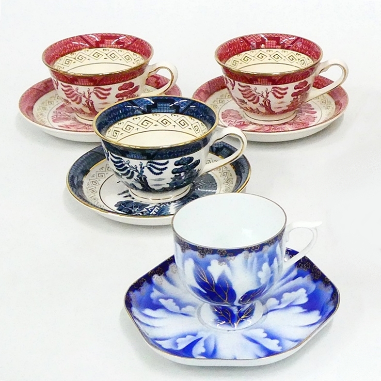 - ニッコー ダブルフェニックス 赤山水 青山水 コーヒーカップ 3客 / 深川製磁 カップ&ソーサー 牡丹金ミル 高台 コーヒー碗皿 セット Kキ00