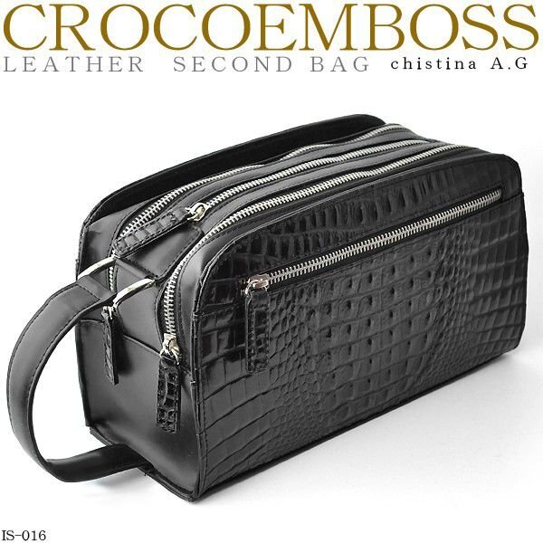 - 【Christina A.G.】クロコ型押し牛革トリプルファスナーセカンドバッグ■IS-016■ブラック