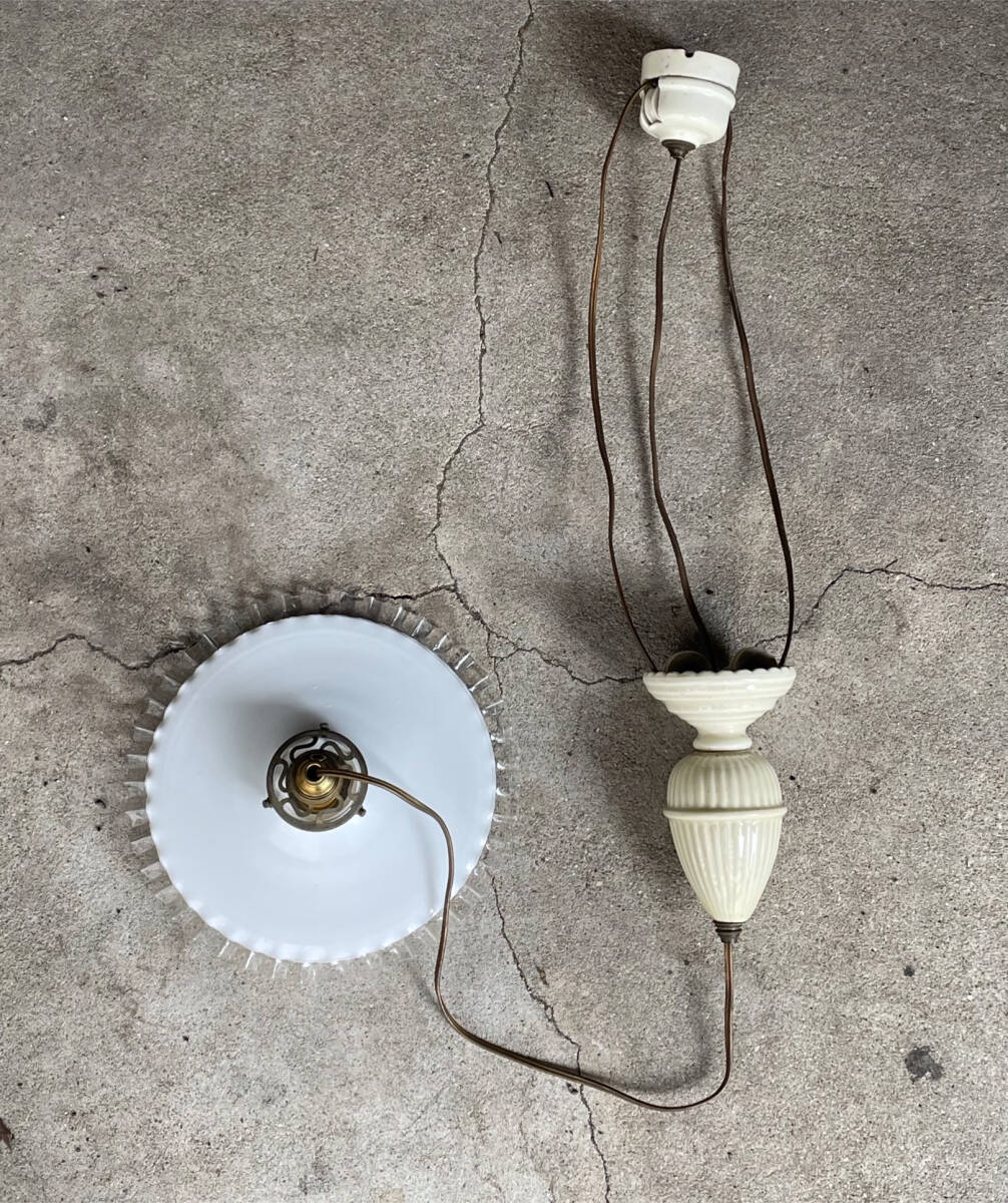 - 2c. フランス 吊り下げ 滑車 ランプ 古道具 店舗什器 カフェ アンティーク 古民家 蚤の市 ミルクガラス シェード