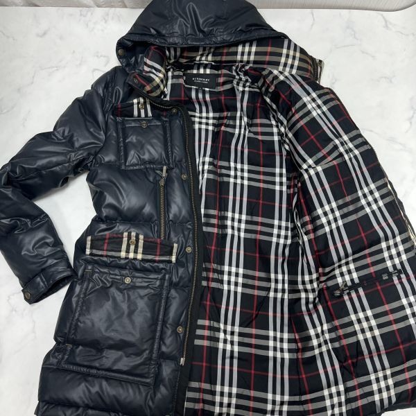 - 外観美品 バーバリーブラックレーベル ダウンジャケット ロングコート フード 2way ノバチェック ホースロゴ 濃紺系 B1315
