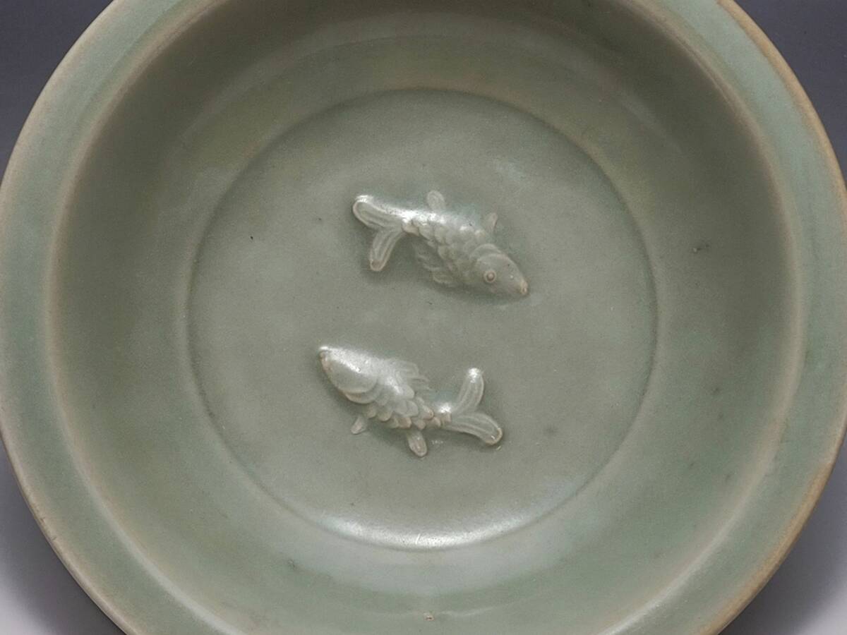 > ● 幅 約 21.7cm 陽刻の双魚文が非常に精巧で美しい 時代唐物 青磁 陽刻 双魚 蓮瓣紋 皿・宋元時代 盤 皿 手塩皿 浅盤 茶道具 煎茶道具 ●