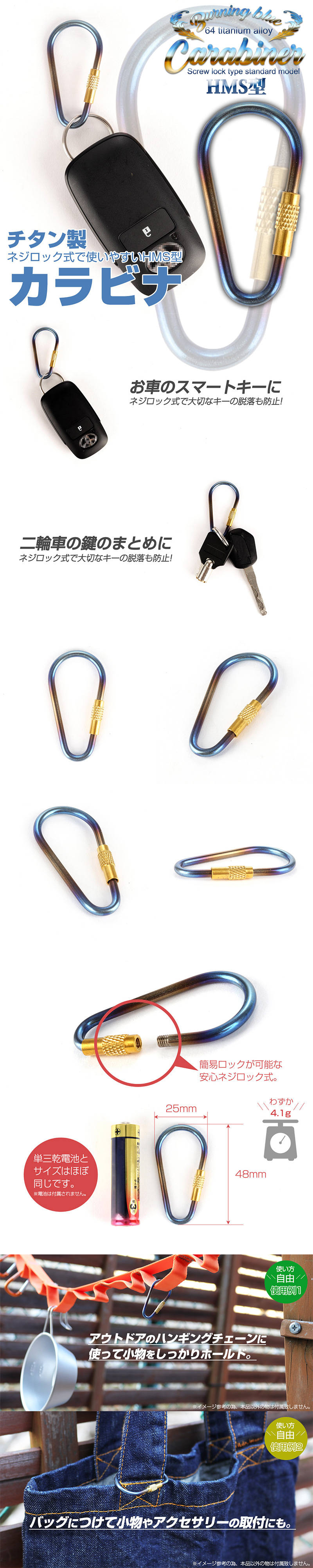 - カラビナ フック HMS型 洋ナシ型 ネジロック式 焼チタンカラー チタン製 小物ホルダー キーチェーンに JA953