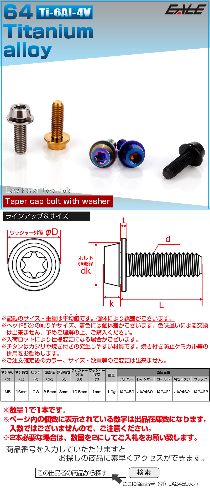 - チタンボルト M5×16mm P0.8 低頭 キャップボルト ワッシャー付き トルクス穴 焼きチタンカラー JA2462