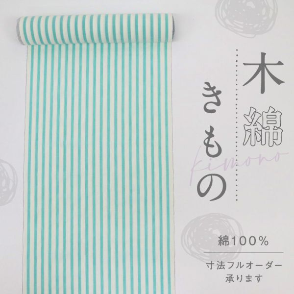 - 【反物】 浴衣 爽やかストライプ縞模様 白×グリーン 木綿 夏着物 お仕立て可 反25-117