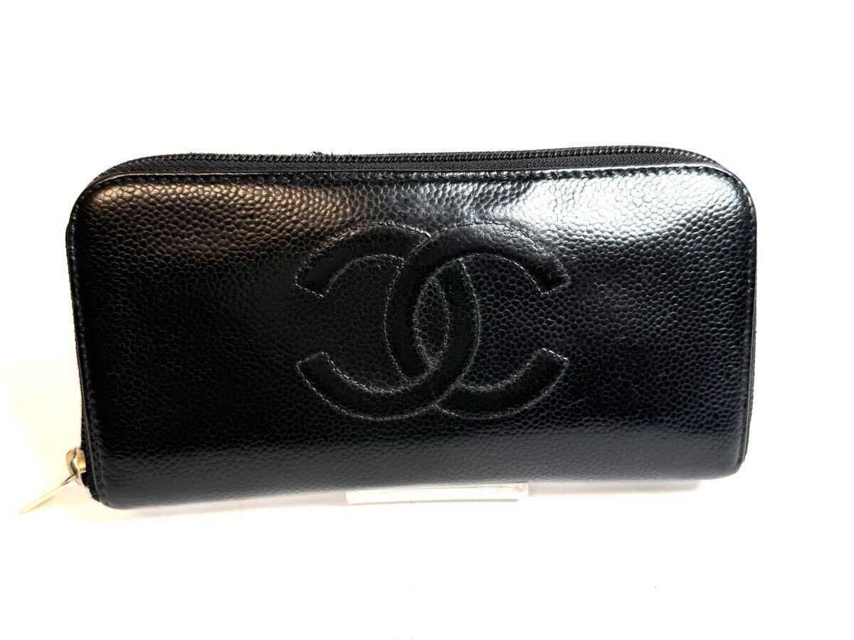 - 860 美品 CHANEL シャネル デカココマーク キャビアスキン ラウンドファスナー 長財布 ウォレット 小銭入れ 札入れ ブラック系