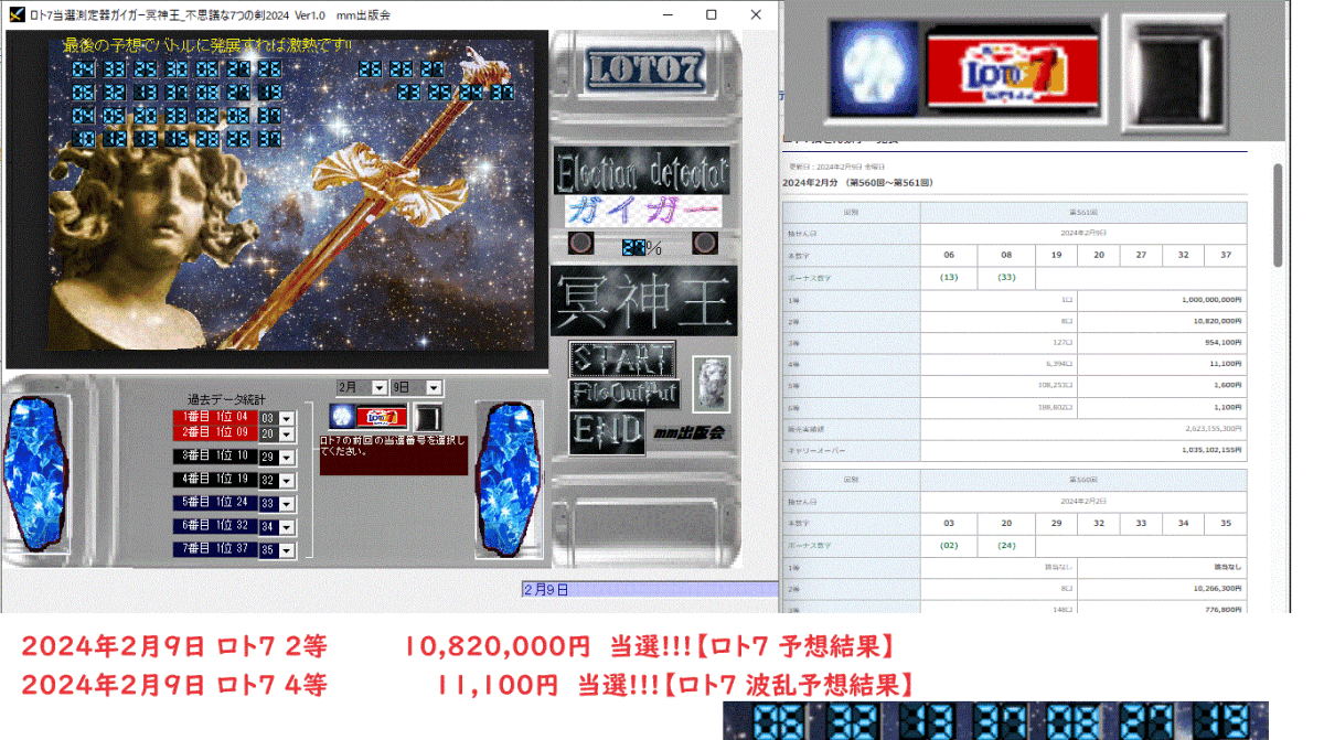 新作 [ロト7当選測定器ガイガー冥神王_不思議な7つの剣2024] のご案内です2024年2月9日 ロト7 2等 10,820,000円 当選です! ロト7ガイガー冥神王の不思議な7つの剣シリーズ2024年版が満を持して登場!!! 今回もテーマ曲が「the seven brave of wonder」を梅本先生からご提供頂きました。 今やAIの時代です。ユーザー様と共に時代の最先端を走っています。今週は、未当選の方も、そろそろ10億当てて人生大勝利目前!2024年2月9日 ロト7 2等 10,820,000円 当選!!!【ロト7 予想結果】 2024年2月9日 ロト7 4等 11,100円 当選!!!【ロト7 波乱予想結果】 [ロト7当選測定器ガイガー冥神王_不思議な7つの剣2024] 開催日: 2月9日【ロト7 予想結果】(TT)期待度☆★ VS ライオンビルダーバトル冥神王 剣が刺さり勝利 [[04]] [[33]] [[25]] [[30]] [[06]] [[27]] [[26]] ★勝負気配27% [[06]] [[32]] [[13]] [[37]] [[08]] [[27]] [[19]] [[04]] [[05]] [[20]] [[33]] [[02]] [[6]] [[37]] [[10]] [[12]] [[13]] [[15]] [[28]] [[26]] [[36]] [[26]] [[26]] [[27]] [[23]] [[25]] [[24]] [[37]][ロト7当選測定器ガイガー冥神王_不思議な7つの剣2024] 開催日: 2月9日 [[03]] [[33]] [[25]] [[2]] [[06]] [[32]] [[15]] [[06]] [[32]] [[13]] [[37]] [[19]] [[20]] [[17]] [[04]] [[05]] [[20]] [[17]] [[06]] [[06]] [[32]] [[03]] [[12]] [[13]] [[15]] [[28]] [[26]] [[37]] [[31]] [[26]] [[27]] [[23]] [[25]] [[24]] [[37]] 過去の当選結果の分析を正確に分析し、的確な予想結果を出力できるように進化しました。★ロト7予想ソフト [ロト7当選測定器ガイガー冥神王_不思議な7つの剣2024] 説明★ 買うロト7券の当選確率の測定ができる予想ソフトです。 (どのロト券を買うかをソフトで選択するだけで、当選率の%が出ます) 直近4,5回程度のロト7当選数字をデータベースとして参照する事により、的確な傾向を把握。 表示_11.txtを自分で、毎週追加して編集することにより、常に最新データベースを保持できます。 たとえば、ロト7の結果が、4 7 9 14 21 35 37 でしたら、4,7,9,14,21,35,37 の様に表示_11.txtを開いて追加すればOKです。 よく出ている当選数字の桁別の頻度をマークする事により、感に頼らずいつも高配当のロト券を狙えます。 的中確率を期待度として%で表示する事により勝負気配がありかをチェックできます。 この [ロト7当選測定器ガイガー冥神王] いかに凄いかが、想像できますよね♪ 【ロト7 測定モード】・・・【測定対象】当選確率 % 頻度順で 1点 【直近1位~2位の頻度の数字】当選確率 % 頻度順で 3点 ですから、必ず測定モードは、行うようにして下さい。 増えても、8点の800円ですから、10億獲れる可能性が高いなら、買って安心だと思います。 【ロト7 予想モード】・・・直近1位の頻度の数字を中心とした 予想番で 4点。 過去に一番の頻度の数字になっている番号を出してくれる便利なモードです。 (但し、このモードは、参考にはなるんですが、まだこのモードで当選は有りません。) しかし、どの当選数字が来ているか、必ず見ると思いますので、非常に使えるモードです。予想結果は、テキストファイルに出力したり、印刷も可能です。おそらく皆様も、ロト7を予想する際は、過去の当選数字が何番だったかを、大変気にされるとこれを気に留めて置かないと、感で予想することになります。どの数字が、よく当選数字で出ているかを、コンピュータが教えてくれるのですから、それどころか、何千万も掴むことも、これから、何回もあるかと思います。この予想ソフトは、測定も含めて、最近の当選数字を表示してくれますので、★★★★ VS ティラノ星人バトル(銀河最強の宇宙人)各種で、あるいみ凄いバトルがガイガー冥神王を待ち受けている!是非、今週からご使用して、高配当のロト券を狙ってみてはいかがでしょうか?豪邸プール付きと、海外クルージングの旅、高級車などが来週待っているかも知れませんね●ランプ点灯(^^)期待度☆☆☆★ VS ライオンビルダーバトル冥神王勝利これが出たので2等10,820,000円 当選です!次も★勝負気配22%以上を出してとワクワクしてきます♪ ★★★★ VS ティラノ星人バトル(銀河最強の宇宙人)が出た日には・・・[ロト7当選測定器ガイガー冥神王_不思議な7つの剣2024] 予想ソフト 価格398000円 ⇒ 3000円