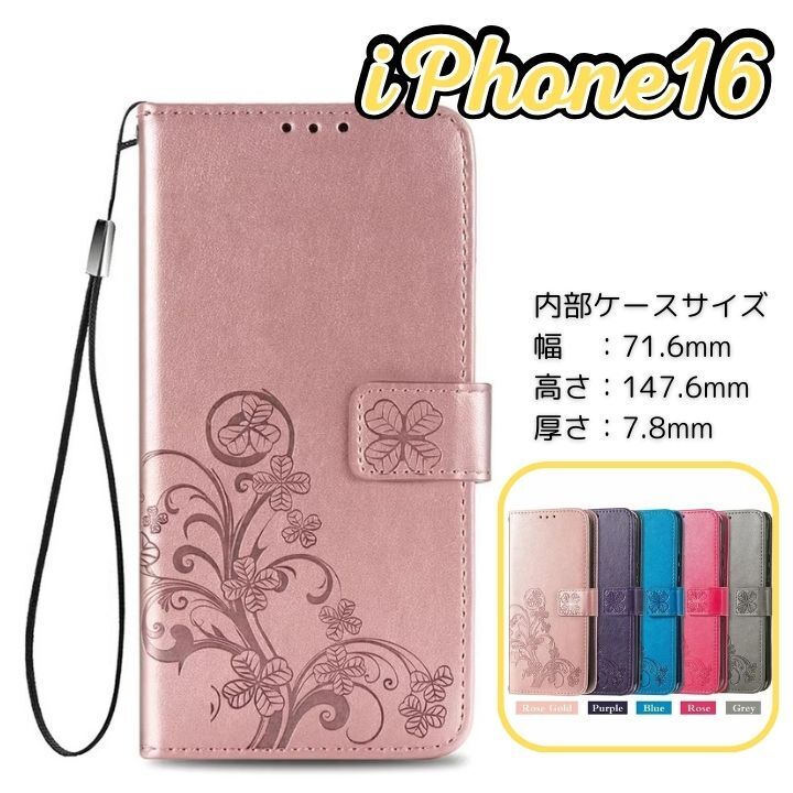 - iPhone16専用 手帳型ケース エンボスピンク花柄デザイン 高級PUレザー素材 カード収納&マグネット式