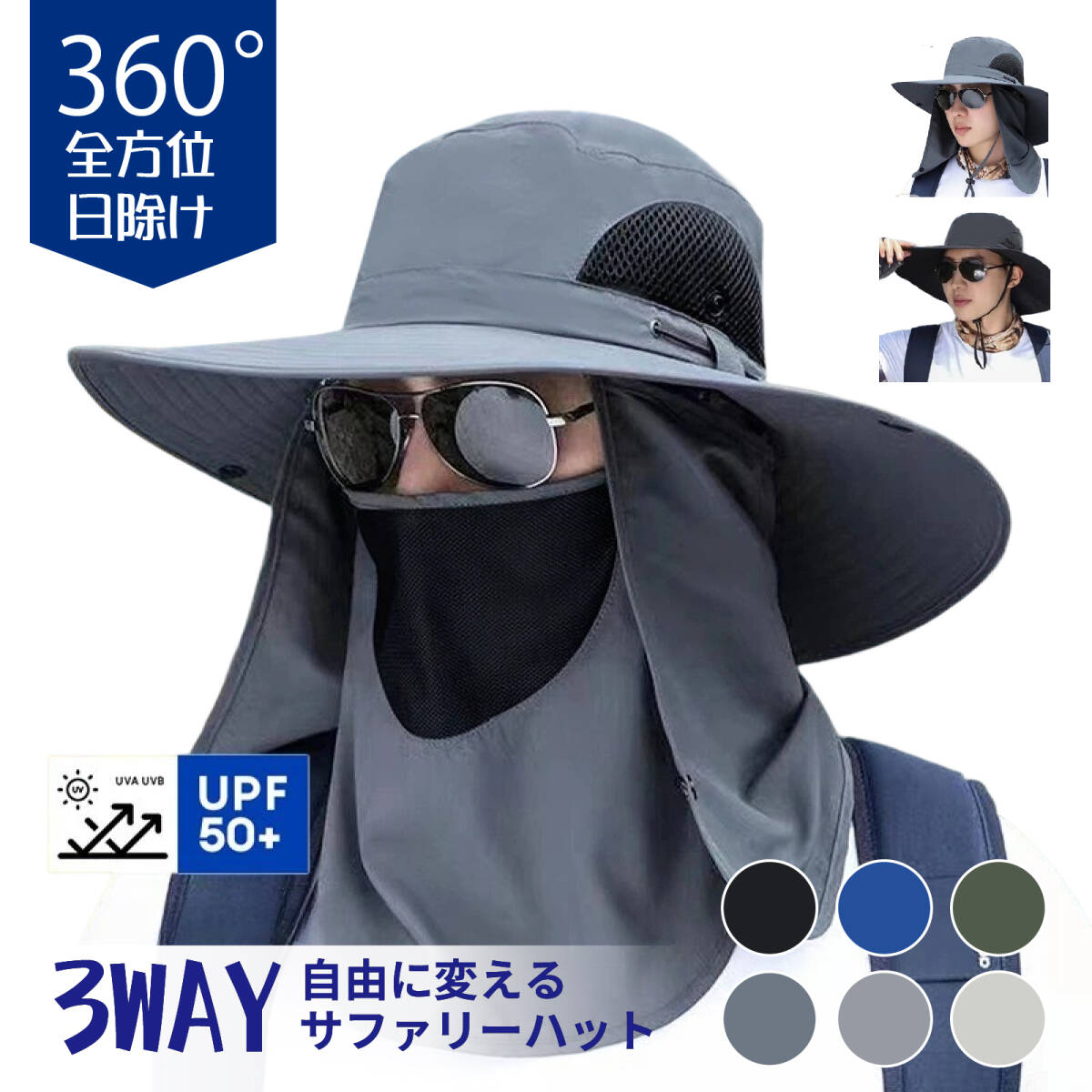 - 日よけ帽子 サファリハット つば広 レディース メンズ フェイスカバー付き 首ガード 紫外線対策 アウトドア 360度UVカット 日焼け防止 通気