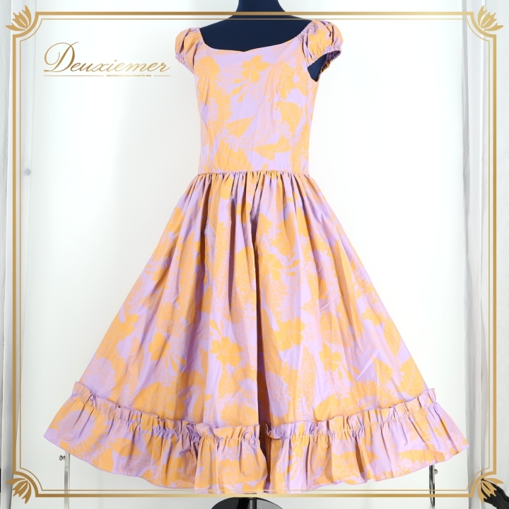 > フラダンス 衣装 ワンピース ドレス パープル系 アロハスタンダード フラ ダンス 紫 黄 ハワイアン マイレ柄 花柄 淡い アロハ ふんわり