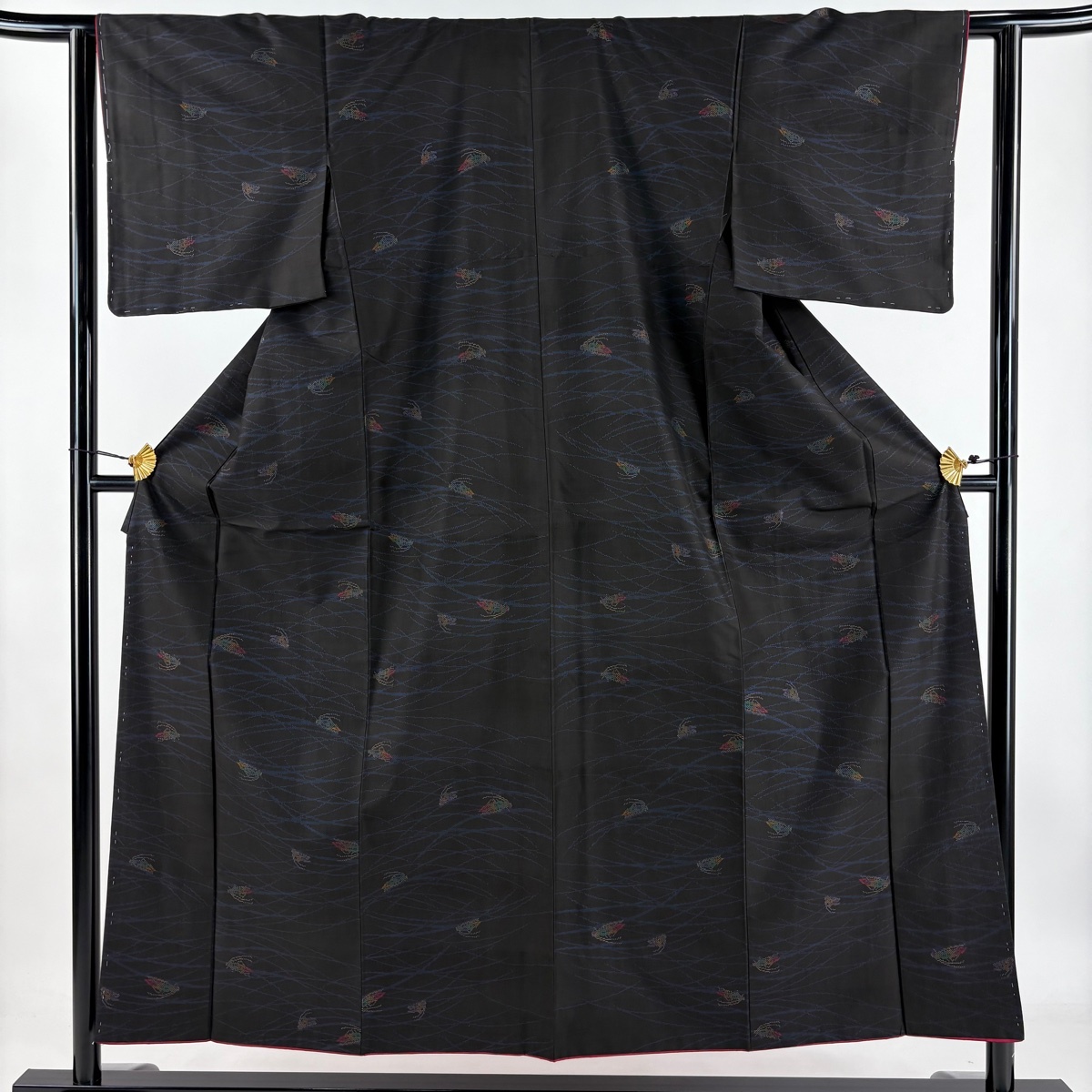 - 紬 身丈152.5cm 裄丈61.5cm S 袷 葉柄 バッタ 墨色 正絹 美品 秀品 【中古】