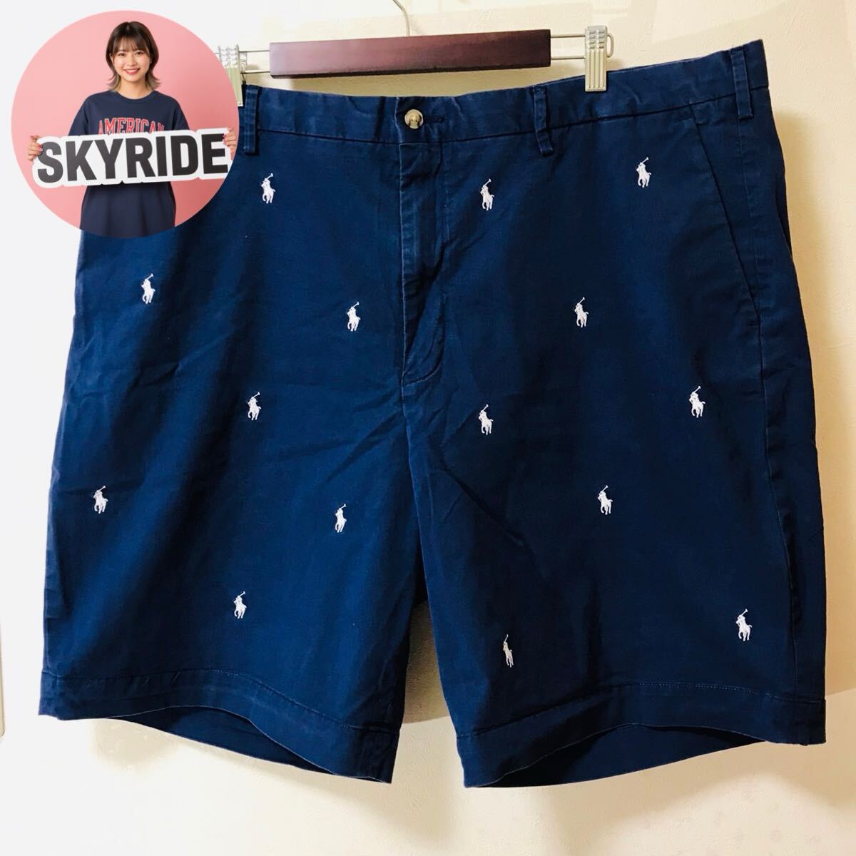> 【定番】Polo Ralph Lauren ポロラルフローレン メンズ ハーフパンツ 紺色 42 マルチポニー刺繍 総柄 刺繍ロゴ ビッグサイズ 古着 #TT0292