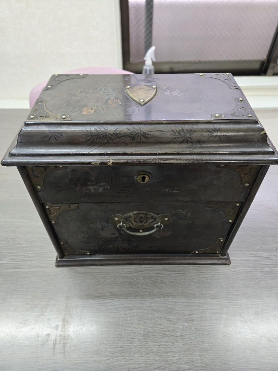 - 花柄装飾の木製収納箱 昭和レトロ鍵無し アンティーク 古道具 小箪笥 木製 ヴィンテージ ビンテージ 昭和レトロ 中古 ★送料無料★
