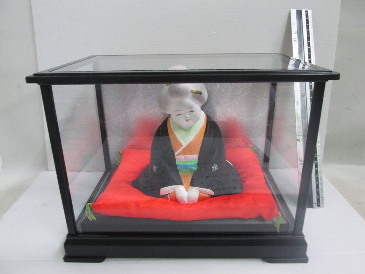 - お福さん 座布団付き 置物 人形 陶器 縁起物 商売繁盛 インテリア アンティーク ガラスケース入り(幅27cm) 古い物でよくみて