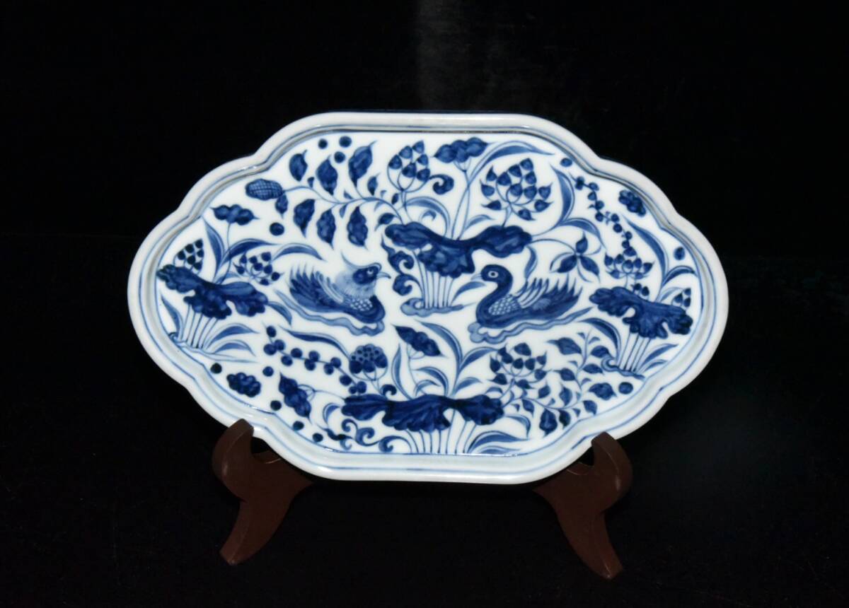 - 蔵友旧蔵出 元 青花 鴛鴦戲水紋 異形盤 稀少珍品 貴重品 古陶瓷品 置物 古賞物 中国古玩 中国古美術品