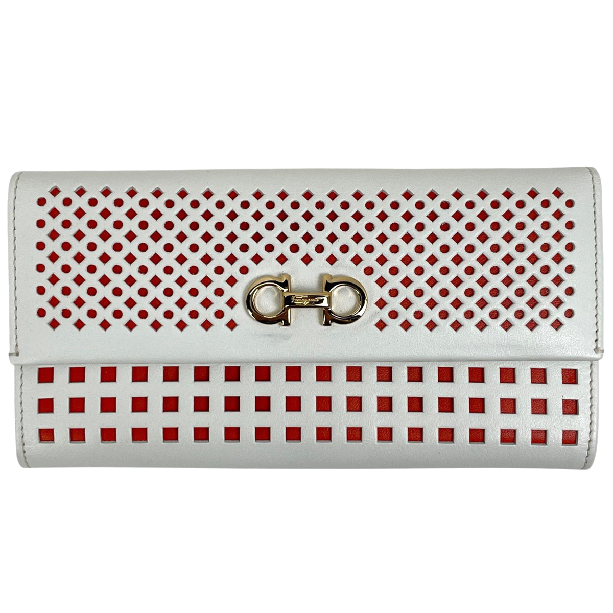 > サルヴァトーレフェラガモ Salvatore Ferragamo ガンチーニ 二つ折り長財布 パンチング レザー ホワイト オレンジ レディース 【中古】