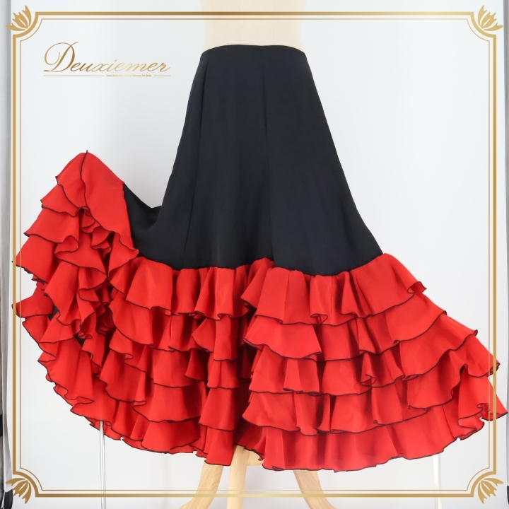 - フラメンコ 衣装 ファルダ スカート 赤 黒 ボランテ フリル ダンス 発表会 ボリューム 無地 ブラック系 レッド系 フレアスカート 祭り 衣装