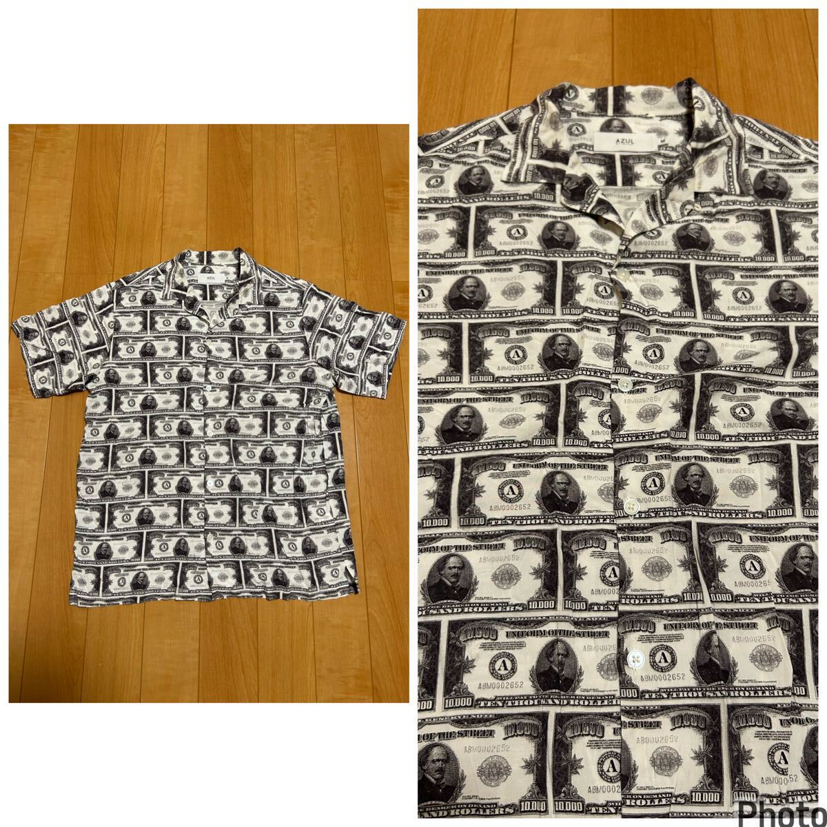 > ☆Azul By Moussy メンズサイズM 半袖レーヨン.オープンシャツ 希少.ドル紙幣調総柄 ダラー.Dollars.お金 ビンテージアロハ風 白地!