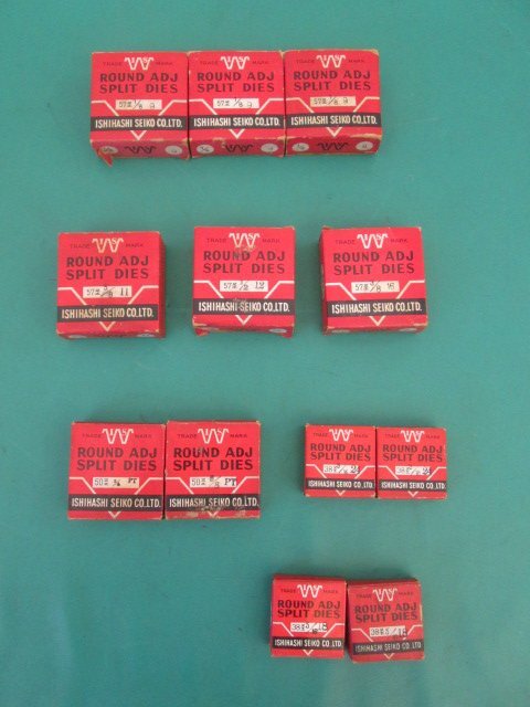 未使用品 イシハシ精工 ダイスROUND ADJ SPLIT DIES インチサイズ表示 8種類12個 保管在庫品 未使用品です。 ・57径 7/8 9・・・3個、57径 5/8 11・・・1個、57径 1/2 12・・・1個、57径 3/8 16・・・1個 ・50径 3/4 PT・・・1個、50径 5/8 PT・・・1個 ・38径 3/16 24・・2個、38径 5/16 18・・2個 経年品です。個装箱、傷んでいます。 油紙の内側に汚れ、サビあります。 梱包サイズ:幅18cm 奥行12cm 高さ14cm 重量2.2kg