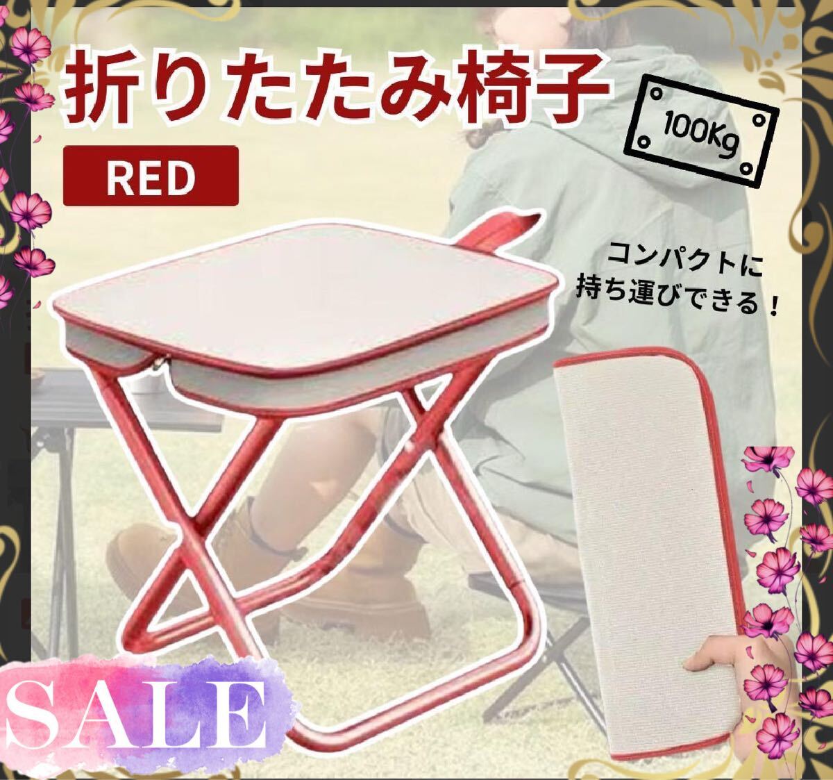 - 折りたたみチェア スツール 軽量 携帯 ジッパー収納 耐荷重100kg レッド コメントでお値引き