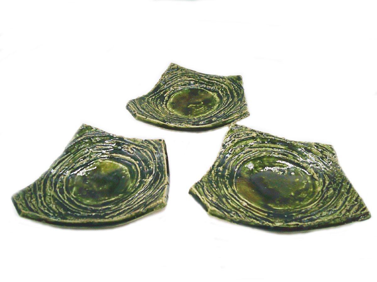 > ★1【未使用品】 金本卓也 大和織部 足付皿 変形 3枚 和食器 焼き物 陶磁器★/H