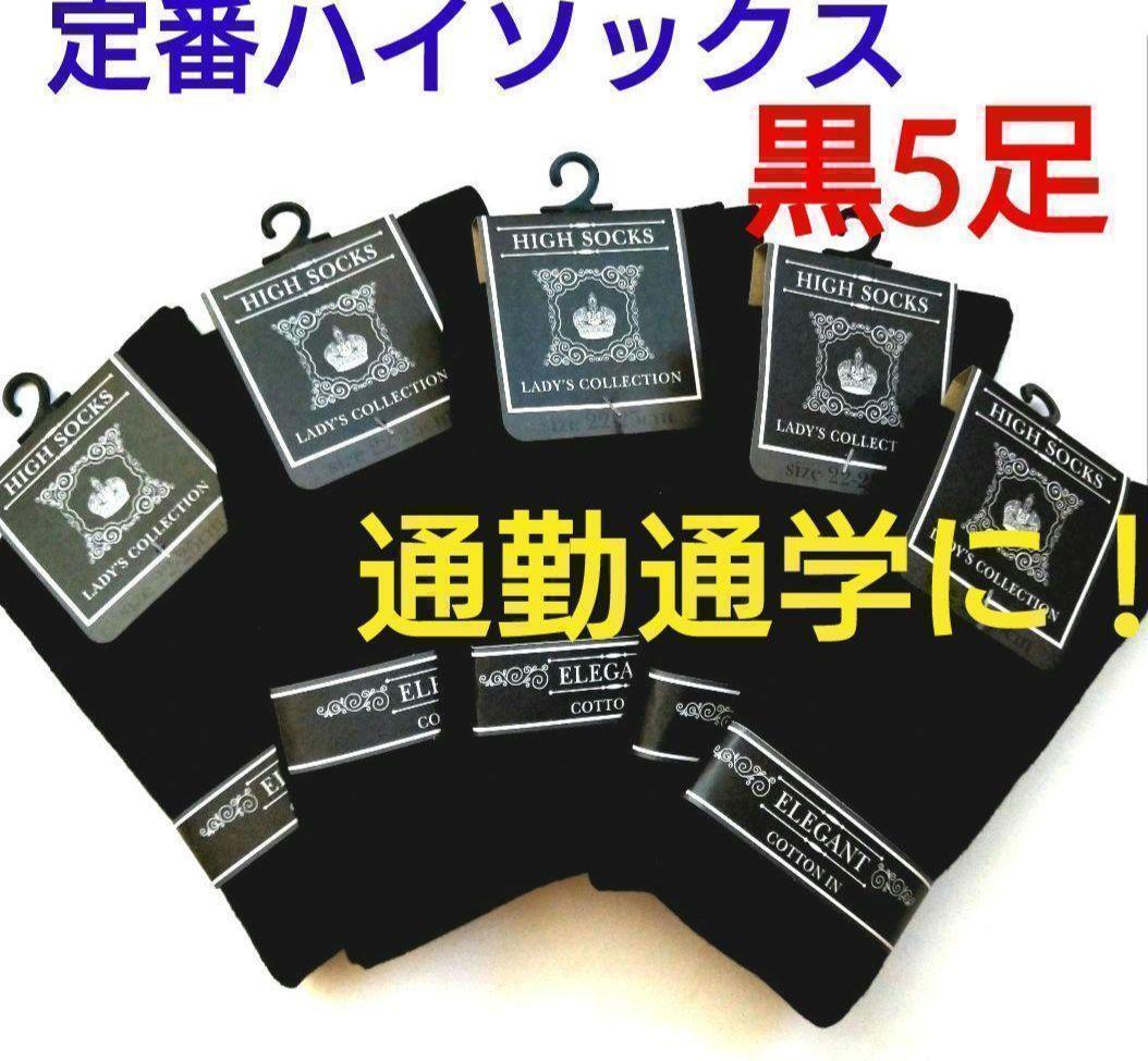 - レディース ハイソックス 綿混婦人靴下 定番 学生 通勤に!!全ブラック5足