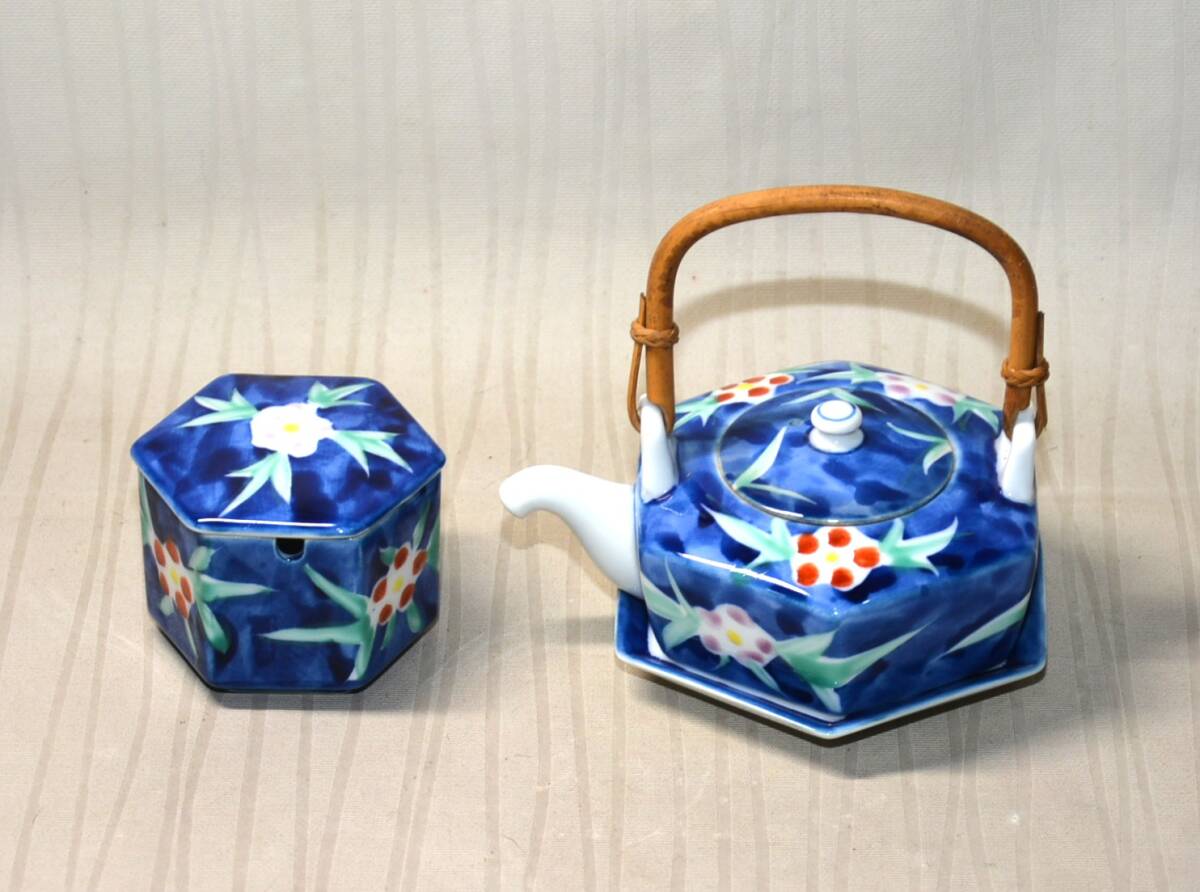- 95◆初荷です ◆華 在銘 染錦花文竹手付醤油差 受皿 薬味入セット