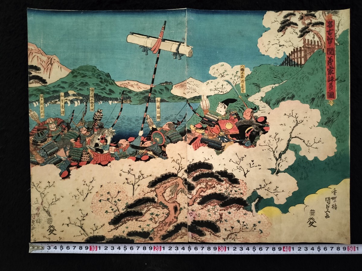 > 江戸期/真作 歌川国貞「名古曽ノ関義家詠歌之図」本物浮世絵木版画 武者絵 戦争絵 合戦絵 錦絵 大判 裏打ち 二枚続き