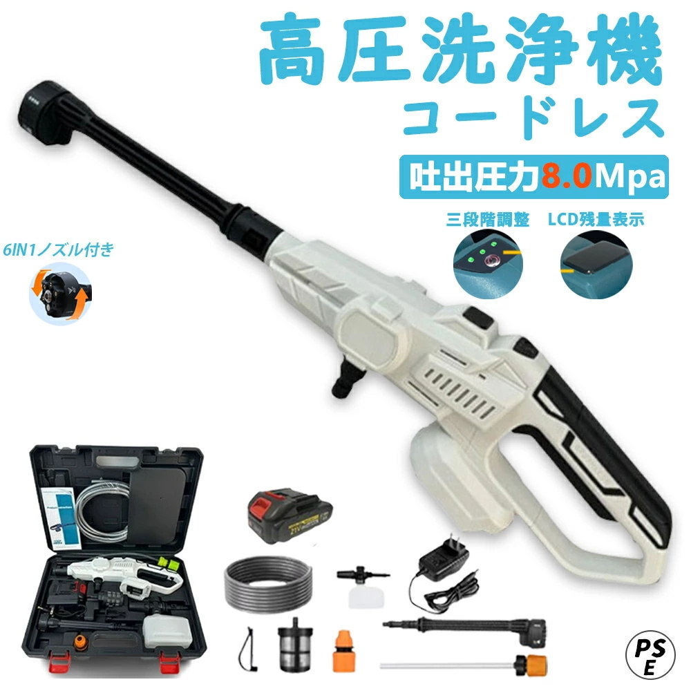 - 高圧洗浄機 コードレス 充電式 3段階水圧 6in1 バッテリー1個付き マキタバッテリー互換 8MPa吐出圧力 強力噴射 自吸式 収納ケース付 洗車