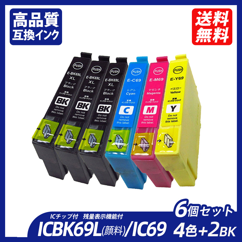 - IC4CL69+ICBK69L×2 4色+ブラック2本 計6本 エプソンプリンター用互換インク EP社 ICチップ付 残量表示ICBK69L ICC69 ICM69 ICY69 ;B11665;