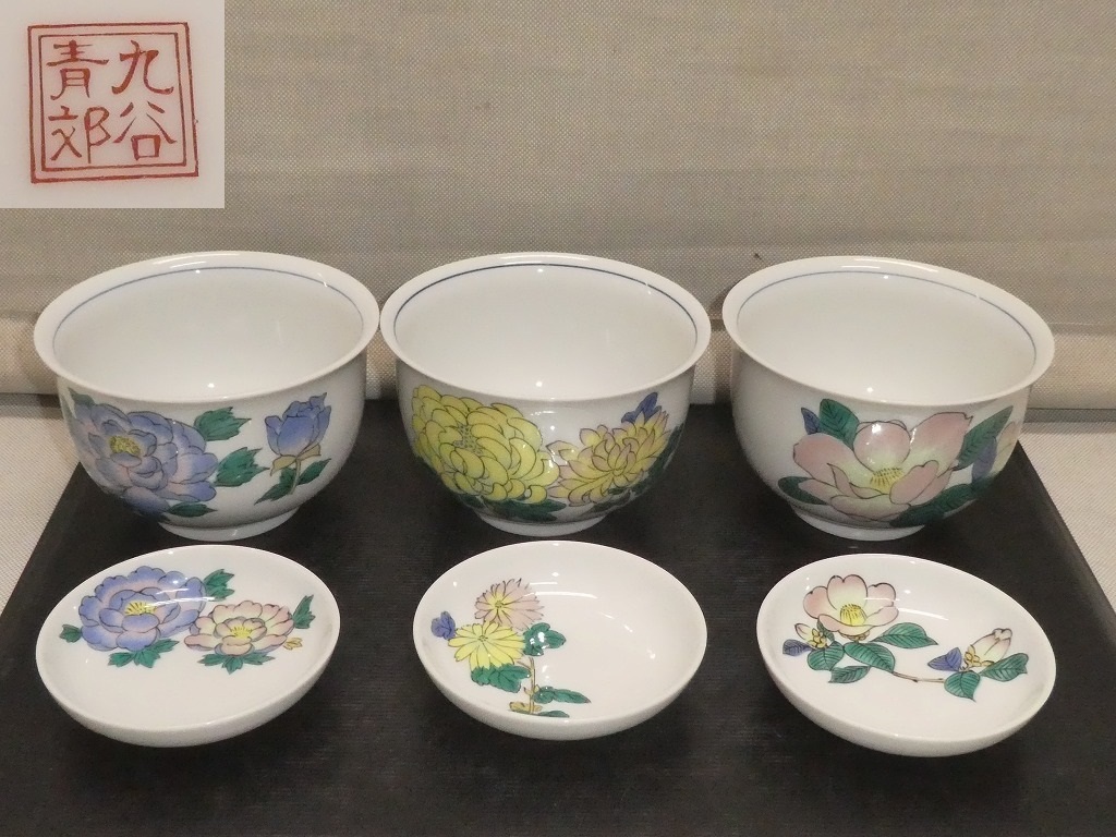 > ●九谷焼 九谷青郊 青郊窯 絵変わり 丼小皿 計6点セット 丼3客 小皿3枚 小どんぶり鉢 色絵 和食器 小料理屋 日本料理●