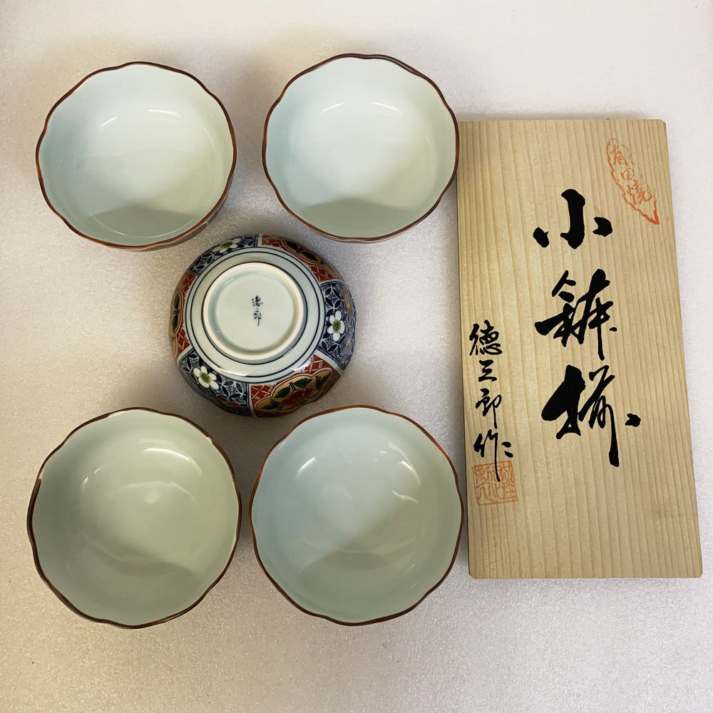 - 未使用品 有田焼 徳三郎作 赤絵花地紋小鉢 5点セット Arita ware 45390 木箱付き 中鉢 磁器【4837