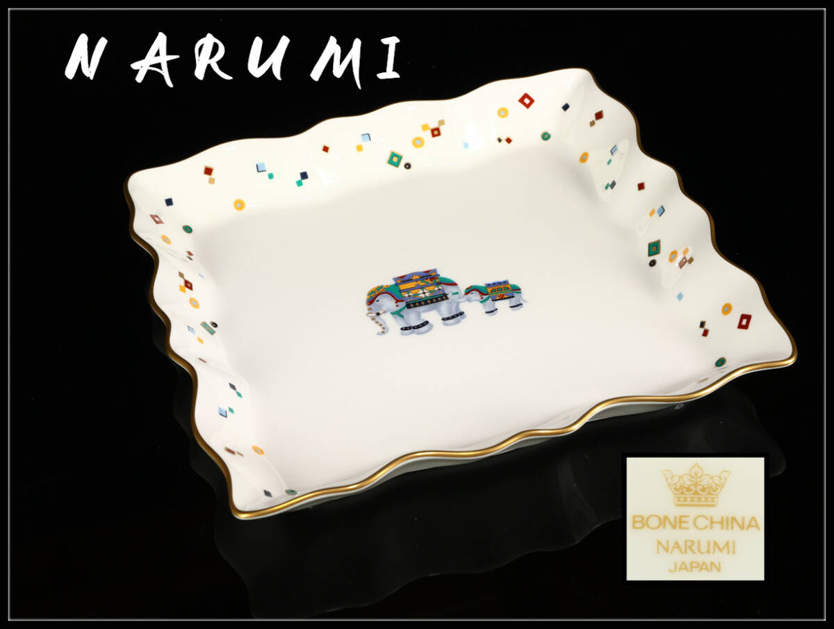 - 久1144 【NARUMI】 ナルミ 色絵象紋 輪花 方プレート 共箱付 未使用品