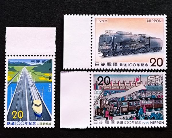 > [25091106]【鉄道100年記念】単片3種完「山陽新幹線 蒸気機関車形式C62 鉄道開業の図」20円×3 1972年発行 美品