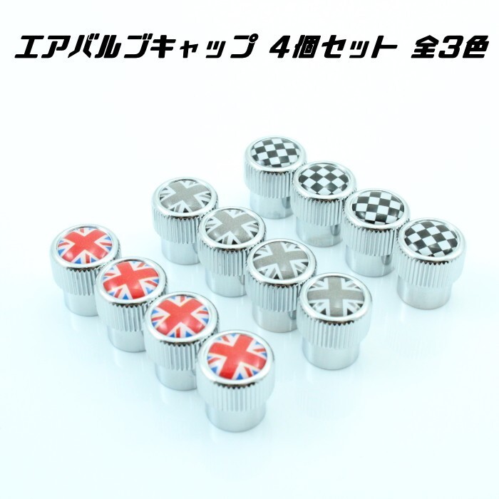 - タイヤ エアバルブキャップ シルバー 4個セット 全3色 ユニオンジャック チェッカーフラッグ BMW MINI ミニクーパー などに最適