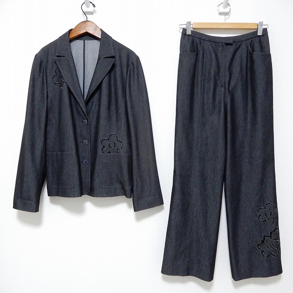 > #anc レリアン Leilian セットアップ ツーピース 9 黒系 麻混 デニム調 花モチーフ レディース [961904]