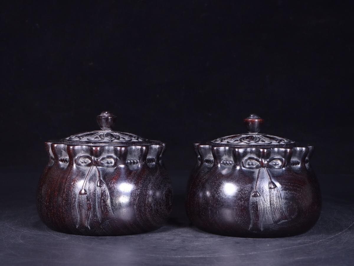 - 「清時代 老紫檀の木 彫り 錦嚢式 囲碁罐 一対」極細工 擺件 賞物 古美術 骨董品 旧蔵出