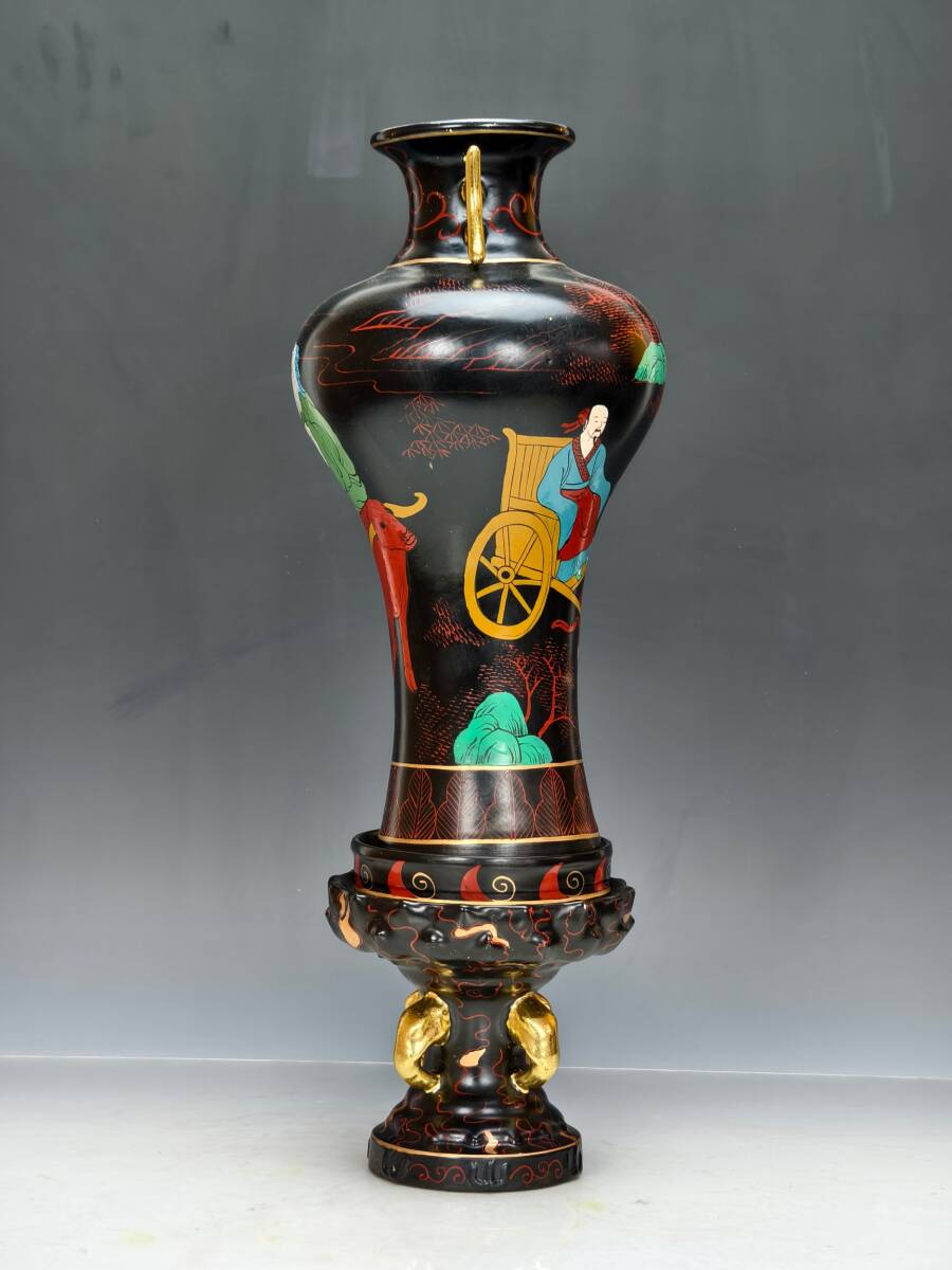 - 多宝閣 ■ 208844 人間国宝 中国磁器【天青如磁「黒釉漆彩」回転花瓶】工芸品 施釉陶 陶芸 置物 收藏品 孤品