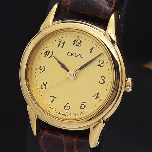 - 良品 セイコー QZ V701-1930 ゴールド文字盤 ラウンド レディース腕時計 NKG