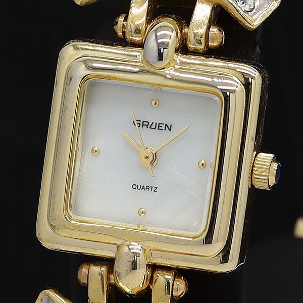 - 稼働 良品 グリュエン QZ アンティーク 石付 スクエア ホワイトシェル文字盤 レディース腕時計 STU
