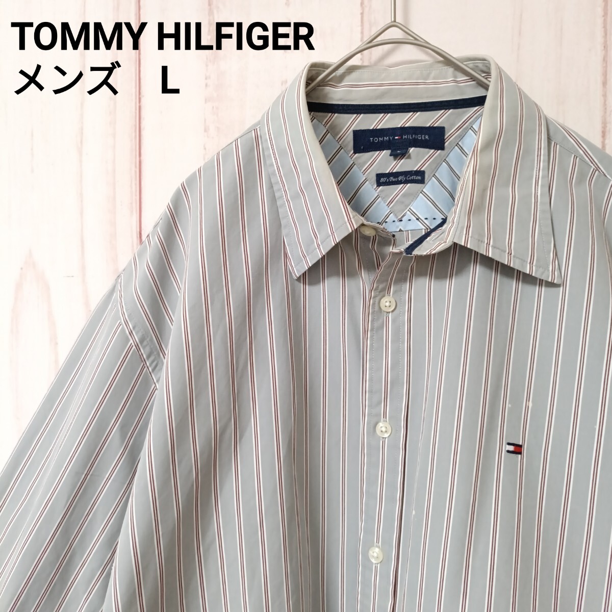 > TOMMY HILFIGER トミーヒルフィガー メンズ L 長袖シャツ ストライプ グレー ホワイト 灰色 白色 綿100%