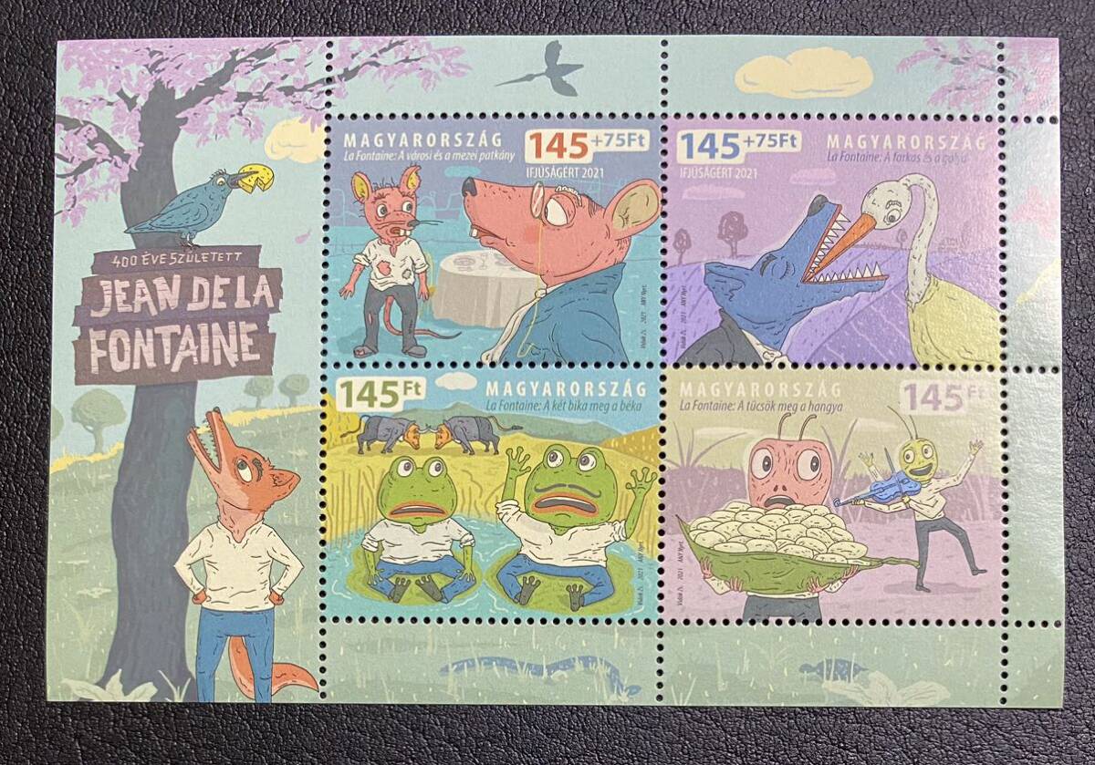 > ハンガリー ラ・フォンテーヌ誕生400年 童話 オオカミとコウノトリ 2匹の雄牛とカエル アリとキリギリス 小型シート1種完 未使用 NH